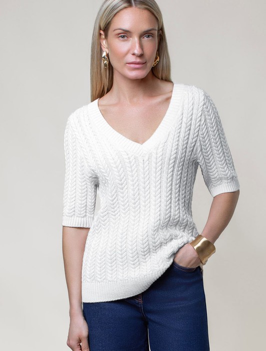 Состав: 70%Хлопок 21%ПА 9%Кашемир Плотность: 12 GG Размер товара на первом фото: 42Джемпер фактурной вязки выполнен из хлопка с добавлением кашемира. Модель с V-вырезом с вывязанным орнаментом цепи. Мягкая и очень приятная пряжа совершенно не колется, сохраняет тепло при этом не перегревая, гарантируя безупречный комфорт.