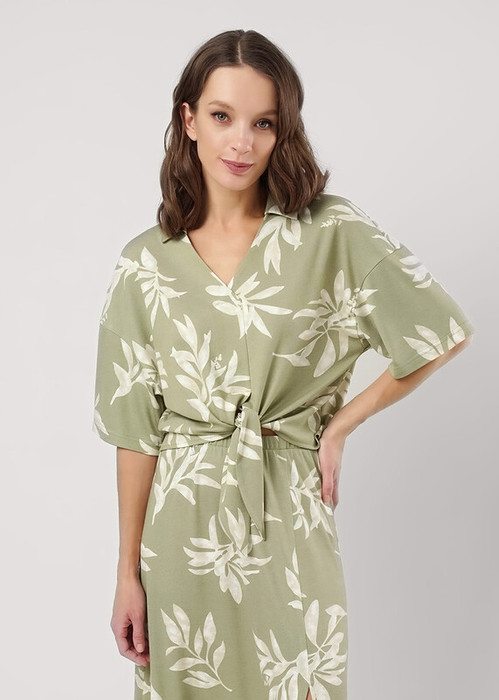 Блузка из вискозного трикотажного полотна пике свободного силуэта. Короткий втачной рукав. По горловине отложной воротник с внутренней обтачкой. Спереди имитация борта с внутренней обтачкой, по низу бант завязка.