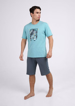 Комплект мужской для дома состоящий из футболки и шорт. Футболка из трикотажного полотна с круглым вырезом горловины, коротким рукавом и стильным принтом. Шорты из плотного трикотажного полотна на эластичном поясе с функциональными карманами и шнуром.