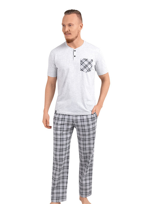 Комплект домашний, состоящий из футболки и брюк. Футболка с круглым вырезом горловины, коротким рукавом, нагрудным карманом и функциональной планкой на две пуговицы. Брюки из трикотажного полотна на эластичном поясе с боковыми карманами и шнуром.