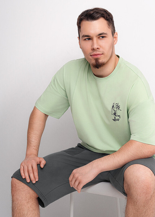 Набор мужской для дома состоящий из футболки и шорт. Футболка из однотонной кулирной глади с круглым вырезом горловины, декоративным резом, коротким рукавом и стильным принтом. Шорты из футера на эластичном поясе с функциональными карманами и шнуром.