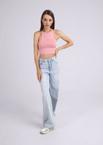 Женская укороченная майка из микрофибры в рубчик. Майка на широкой бретели, с глубоким круглым вырезом.