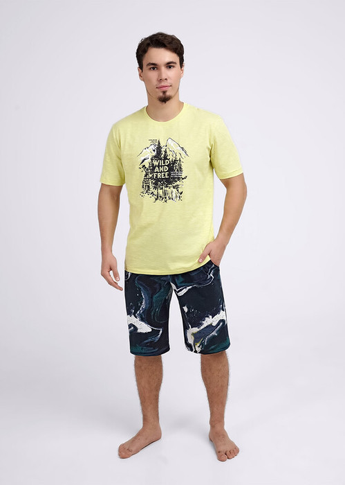 Комплект мужской для дома состоящий из футболки и шорт. Футболка из трикотажного полотна с круглым вырезом горловины, коротким рукавом и стильным принтом. Шорты из трикотажного полотна с набивкой на эластичном поясе с функциональными карманами и шнуром.