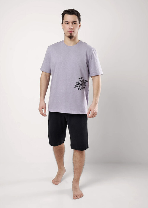 Комплект мужской для дома состоящий из футболки и шорт. Футболка из фактурного трикотажного полотна с круглым вырезом горловины, коротким рукавом и стильным принтом. Шорты из фактурного полотна на эластичном поясе с функциональными карманами и шнуром.