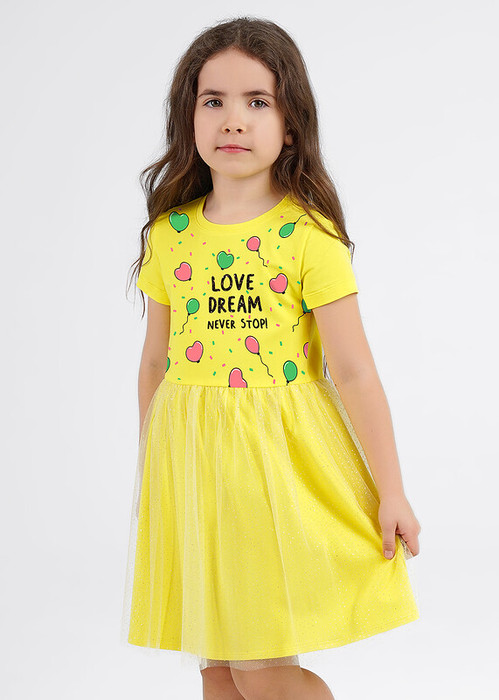 Желтое платье с ярким принтом превратит тебя в настоящую фею! Основа и подклад выполнены их эластичного хлопкового трикотажа, пышная юбка - из мягкой сетки. Такое платье отличный вариант для утренника или дня рождения.