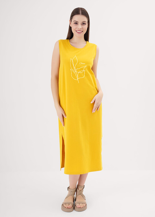 Платье без рукавов для дома и отдыха из хлопкового трикотажного полотна, прямого силуэта. По горловине и пройме обтачки. Карманы в боковом шве, боковые разрезы. Сзади средний шов. Спереди принт вспенка с вышивкой.