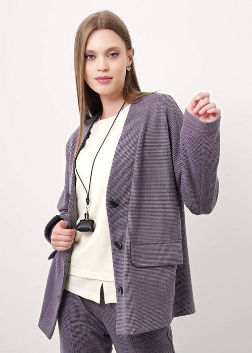 Жакет из трикотажного поливискозного полотна джерси, прямого силуэта. Однобортный с застежкой на пуговицы, по борту внутренняя обтачка. Длинный втачной рукав. Спереди прорезной карман с клапаном. По низу изделия и рукава потайной стежок.