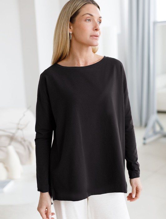 Состав: 92%Хлопок 8%ПУ Параметры модели на первом фото: Рост 170, бюст 89, талия 63, бедра 92Свободный базовый джемпер черного цвета с длинными рукавами и круглым вырезом сшит из премиального хлопка. Однотонная хлопковая модель хорошо поддерживает комфортный для тела микроклимат. Благодаря вплетению эластановых волокон вещь хорошо сохраняет форму. Подходит для любого типа фигуры.