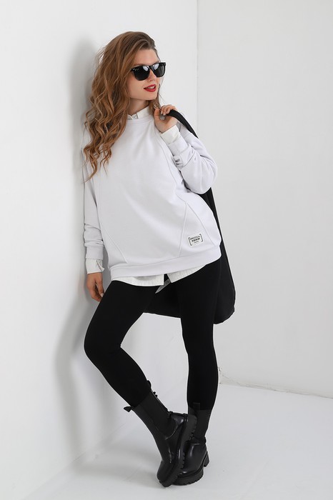 Джемпер молодежный из трикотажного полотна «футер» трехнитка-петля со спущенным плечом, длинными рукавами и горловиной овальной формы, обработанной втачной планкой. На полочке выполнены четыре ассиметричные отделочные строчки. Рукава – с манжетами, низ изделия на притачном поясе, с левой стороны настрочен декоративный элемент.