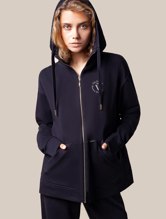 Состав: 80%Хлопок 20%ПЭ Параметры модели на первом фото: Рост 168, бюст 80, талия 60, бедра 90Худи на молнии с золотистой фурнитурой выполнено из премиального футера трехнитки без начеса. Изделие украсили принтом в виде логотипа бренда. Мягкий и уютный трикотаж с добавлением эластана гарантирует абсолютный комфорт даже в прохладное время года, не ограничивая свободу движений. Модель сочетается в костюме с брюками D44.079 и D44.089