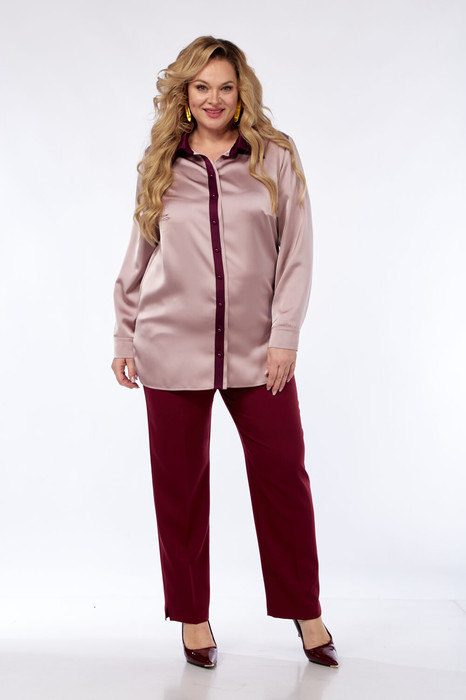 Комплект 2-х предметный, состоит из блузки и брюк. Модная блуза – в контрастном сочетании, это необыкновенно стильно. Воротник классический рубашечный на отрезной стойке, по центру планка с застежкой на акцентные пуговицы, что служит декоративным элементом изделия. Рукав втачной, низ обработан притачной манжетой. В боковых швах предусмотрены разрезы. Брюки с заутюженными стрелками слегка зауженные к низу. Пояс притачной, частично на резинке. Застежка на тесьму-молнию и пуговицу