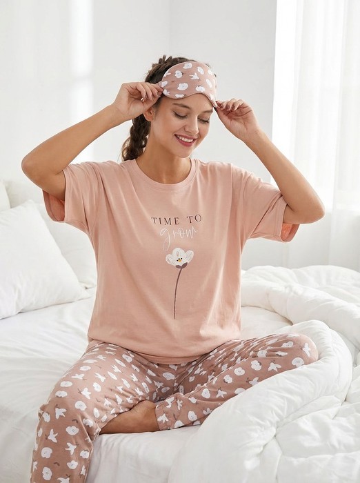 Пижама женская , состоящая из футболки и брюк. Футболка классического покроя, с короткими втачными рукавами, горловиной овальной формы, обработанной втачной планкой, фигурной линией низа и принтом в центре переда, выполненным методом шелкографии. Брюки - длинные, с эластичной тесьмой верхнему и нижним срезам.