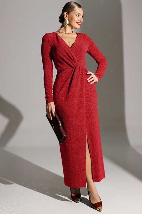Блеск софитов, огни салютов, игривые пузырьки в бокале - и Ваше сияние обеспечено нашим вечерним платьем! Это действительно озорно, игриво, празднично! И, как ни крути, приковывает взгляды! Представленное платье приталенного силуэта. Спинка с талиевыми вытачками. Перед отрезной по линии талии. Лиф с эффектным V-образным вырезом и узлом в области талии. Юбка на запах. Рукав полуреглан, присборенный на резинку в нижней части (по шву). Платье на подкладке. Материал платья - тонкий трикотаж с блеском. Хорошо тянется.