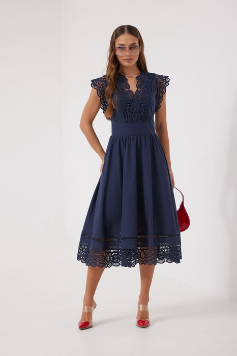 Платье выполнено из хлопкового полотна в сочетании с хлопковым кружевом, на подкладке по низу (50 см). Застежка на потайную тесьму-молнию в левом боковом шве. Платье отрезное по талии, по нижней части присборенно.