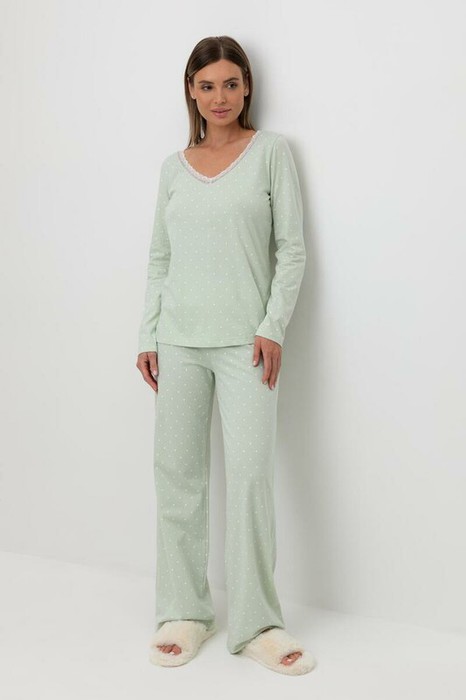Легкий комплект для комфортного сна и отдыха набивного трикотажа с нежным рисунком из 100% натурального хлопка. Джемпер с V-образным вырезом, украшенный эластичным кружевом комфортно садится по фигуре. Брюки с поясом на резинке и атласной лентой. Гладкий материал приятен к телу и позволяет коже дышать.