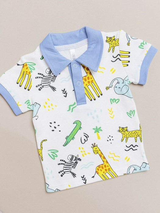 Футболка поло для мальчика c коротким рукавом и принтом в виде разнообразных зверят. Стильная футболка из интерлока подойдет для летнего отдыха и повседневной носки. Воротник с застежкой на пуговицы. Футболка подойдет для малышей от 3 месяцев до 2 лет.Характеристики:Ткань: Интерлок пенье 100% хлопокПроизводитель: batik