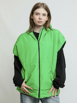 Жилет для мальчика из футера черно-оранжевый с рукавами и капюшоном. Принт с надписями.