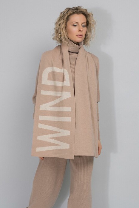 Двусторонний шарф из полушерсти с вывязанным рисунком в виде надписи WIND. Длина - 200 см, ширина - 40 см. Связан гладью. Украшен фирменной этикеткой на внутренней стороне.
