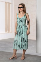 Сарафан молодежный из тканого штапельного полотна с набивным рисунком, слегка расширенный книзу, на узких бретелях, вытачанных из окантовки, двумя вытачками в области груди и оборкой по низу. Вырез горловины по переду и спинке и проймы окантованы основным материалом.