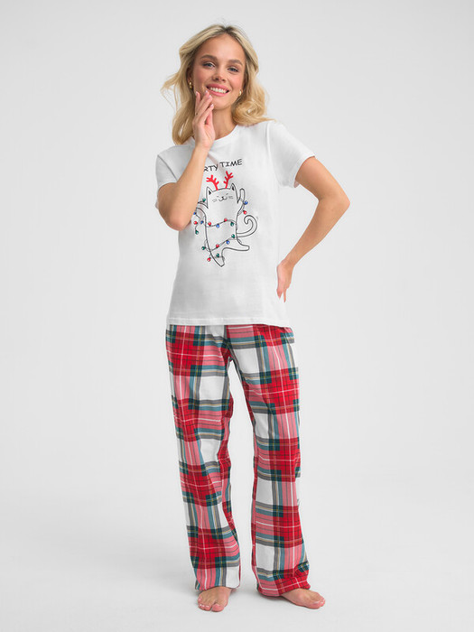 Трикотажная пижама с Новогодней тематикой.  Белая футболка свободного кроя длиной до бердра украшена принтом веселого котика с гирляндой. Принтованные брюки свободного кроя на резинке.