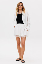 Шорты выполнены из плательно-блузочной ткани. Шорты свободного кроя, расширенные к низу, на притачном поясе. В боковых швах карманы. Шорты декорированы тесьмой-кружевом. Шорты на отлетной по низу подкладке.