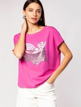 Футболка выполнена из премиального хлопка с эластаном. Лаконичный принт выполнен россыпью сияющих страз в тон изделия. Модель среднего объема дополнена подворотами на рукавах. Подходит для любого типа фигуры. Изделие дополнено металлическим логотипом бренда.