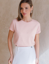 Футболка выполнена из премиального хлопка с эластаном. Лаконичный принт выполнен россыпью сияющих страз в тон изделия. Модель среднего объема дополнена подворотами на рукавах. Подходит для любого типа фигуры. Изделие дополнено металлическим логотипом бренда.