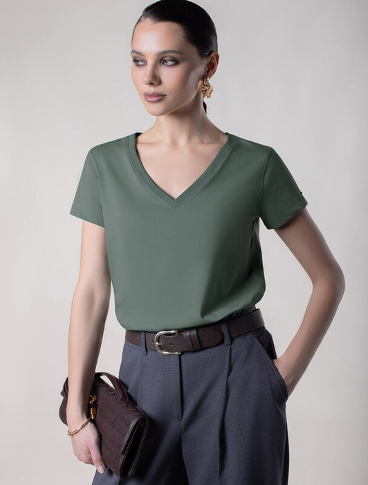 Совместные покупки Нижний Тагил Женская одежда Футболки — Акция Vilatte Футболка из премиального хлопка с V-образным вырезом D49.109 олив