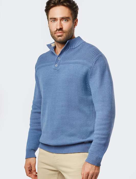 Свитер фактурной вязки с застежкой на крупные кнопки выполнен из мягкой хлопковой пряжи с добавлением акрила. Модель из такого материала не препятствует циркуляции воздуха, но при этом хорошо сохраняет тепло и не колется, поэтому ее комфортно носить на голое тело. С помощью кнопок можно регулировать высоту воротника и носить свитер по-разному. Внизу изделия нашивка бренда из эко-кожи.