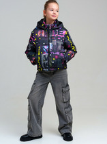 Куртка для мальчиков из тонкой мембранной ткани. Подкладка из флиса. Рукав-реглан. Вход в карманы закрыт большими клапанами зафиксированными в боковом шве. Над клапаном левого кармана, прорезной карман с молнией. Фронтальная молния закрыта широкой ветрозащитной планкой. Планка фиксируется кнопками. Манжеты рукавов обработаны эластичной тесьмой. Несъемный капюшон. Регулировка лицевой части капюшона  выполнена с помощью кулисы со шнуром. Вся фурнитура лаконичного черного цвета. В поддержку — черный и светоотражающий термопринт на спинке и в нижней части левой полочки. На правом рукаве светоотражающий термопринт.Характеристики:Ткань верха: Fitsysem style 1202Подклад: х/б / полиэстер