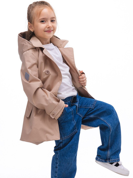 Милая элегантная ветровка-тренч классического силуэта. Отложной воротничок. Двубортная застежка на пуговицы. Уютная подкладка из флиса. Подкладка капюшона выполнена из ткани в мелкую клетку. Два удобных кармана с клапанами. Капюшон съемный, на пуговичках. На правом рукаве и нижней части спинки светоотражающая нашивка. В боковом шве светоотражающий флажок.Характеристики:Ткань верха: мембранная тканьПодклад: полиэстер