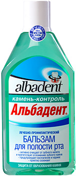 Бальзам прекрасно справляется с очищением обильных зубных отложений, препятствует их образованию и минерализации, уменьшает воспаление и кровоточивость десен, поддерживает минеральный баланс в поверхностных слоях эмали, предупреждая развитие кариеса. Обеспечивает легкое отбеливаниезубов, надолго оставляет ощущение цитрусовой свежести. Активные компонентыПирофосфат натрия - затрудняет отложение зубного камня, предупреждая дальнейшее развитие кариеса и заболеваний десен (стабильность Пирофосфата обеспечивают полимер Gantrez S и фторид натрия)Гидрогенизированное оксиэтилированное касторовое масло – поверхностно-активное вещество- удаляет отложения жировой природы. Способ примененияНаполнить бальзамом колпачок-стаканчик на 1/3 -1/2 его объема и прополоскать полость рта в течение 30-60 секунд.Использовать ежедневно 2 раза в день утром и вечером в конце гигиенической процедуры в полости рта и в промежутках между приемами пищи.Для усиления действия рекомендуем для чистки зубов использовать пасту «Альбадент" Камень-контрольНе глотать. Перед употреблением взбалтывать Не подвергать воздействию прямых солнечных лучей.СоставВода очищенная, пирофосфат натрия, ксилит, ПЭГ-40 касторовое масло, Gantrez S 96 (сополимер полиметилвинилового эфира и малеинового ангидрида), пропиленгликоль, метил-, этил-, пропилпарабены в 1,3— бутиленгликоле, ароматизаторы, эфирное масло лимона, лимонная кислота, фторид натрия, CI 19140, CI 42090. Массовая доля фторида 0,025 %: Действие подтверждено клиническими испытаниями в Стоматологическом испытательном центре «ЦИС» ГПЦ «ПАКС» при СПбГМУ им. акад.И.П.Павлова.