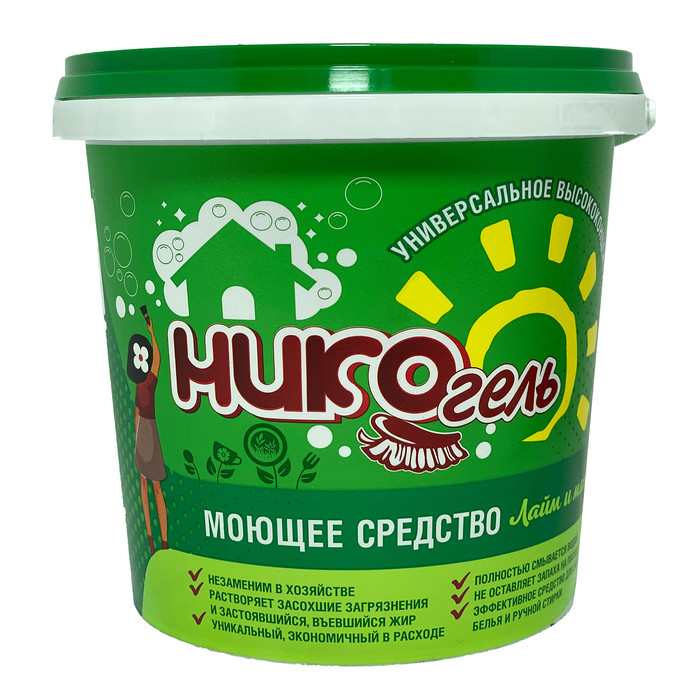 Универсальное Высококонцентрированное моющее средство «Нико Гель» для мытья посуды, жарочных поверхностей, сантехники, кафеля, пищевого оборудования. Мощное средство - антижир. Концентрация поверхностно-активных веществ достигает 42%. Внешний вид — твердый гель. При разведении 1 части в 5 частях воды получается высококачественное жидкое моющее средство. В неразведенном состоянии эффективен как пятновыводитель фруктовых и других загрязнений тканей, может использоваться для ручной стирки белого белья (1-2 столовая ложка средства на 50 литров воды.) При использовании для стирки цветного белья, необходимо сначала полностью растворить гель в воде из расчёта от 1 столовой ложки на 50 литров воды.