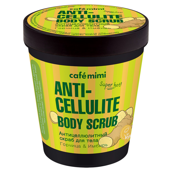 Разогревающий антицеллюлитный скраб на основе морской соли, Горчицы и Имбиря CAFEMIMI - идеальное средство для борьбы с целлюлитом, обеспечивает глубокое очищение и обновление клеток эпидермиса. Горчица обеспечивает разогревающий эффект, раскрывает поры и стимулирует кровообращение, оказывает мощное антицеллюлитное действие. Имбирь тонизирует кожу, повышает эластичность и упругость. Масло Авокадо питает, увлажняет и смягчает кожу.