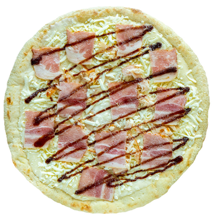 Сытная пицца с насыщенным вкусом. Копченая куриная грудка, бекон, сыр моцарелла, сливочный соус в сочетании с соусом барбекю.