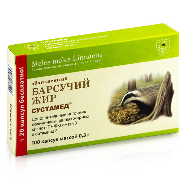 Барсучий жир в капсулах - улучшенный состав лекарства - эффективный, безопасный, имеющий лечебное и профилактическое действие. Капсулы содержат полиненасыщенные жирные кислоты (Омега-3), витамин А и Е, масло зародышей пшеницы.