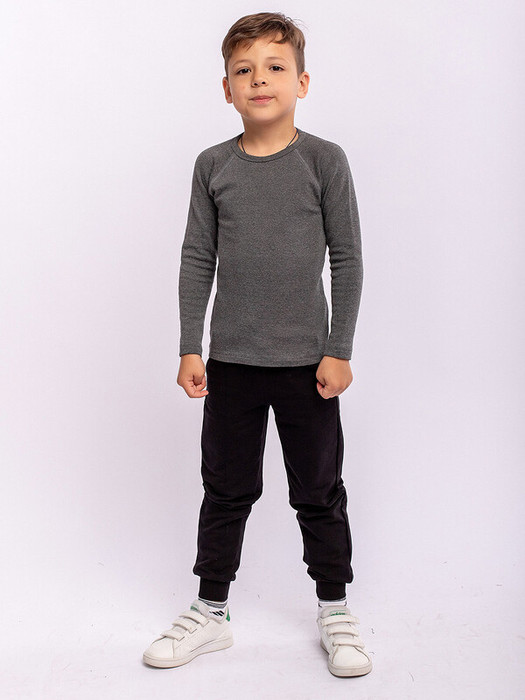 Лонгслив для мальчика из рибаны в графитовой расцветке. Облегающий лонгслив с длинным рукавом-реглан. Мягкий и приятный к телу материал лонгслива делает его подходящим в качестве термобелья в холодное время года.