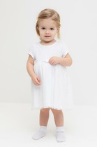 Нарядное платье с пышной юбкой и рюшами из фатина, с декоративным бантом на поясе сзади. На спинке имеется поясок чтобы дополнительно утянуть талию. Подкладка 100% хлопок.