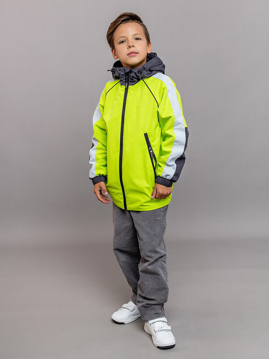 Ветровка для мальчика Стронг эргономичного кроя в лаймовом оттенке. Прямой крой, рукав реглан и удлиненная спинка для удобства и комфорта ребенка. На капюшоне откидной козырек и регулировка. Спереди прорезные карманы на замке. Ветровка декорирована термотрансферами и светоотражающими элементами.  Особенности: Пропитка материала DWRРегулировка объема капюшонаРегулировка по низу курткиСветоотражающие элементыМанжеты рукавов на резинкеЗастежка-молния водонепроницаемая Характеристики:Ткань верха: курточная тканьУтеплитель: нетТемпературный режим от +15°С до +8°СПроизводитель: batik