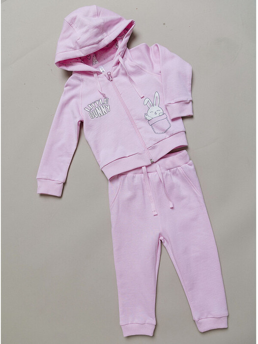 Комплект для девочки из футера розовый: толстовка и штанишки. Толстовка на молнии с капюшоном и рисунком в виде зайчика. Штанишки на резинке с боковыми карманами. Выполнен из футера 2-х нитка с начесом, приятного и гладкого на ощупь, дышащего и гипоаллергенного.Характеристики:Ткань: Футер 2х нитка с начесом 100% хлопокПроизводитель: batik