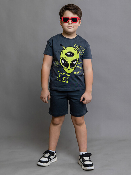 Комплект (футболка + шорты) для мальчика трикотажный из супрема пенье в цвете графит. Футболка с коротким рукавом и принтом в инопланетном стиле.  Приятная на ощупь дышащая ткань комплекта не потеряет свой первоначальный вид после множества стирок.Характеристики:Ткань: супрем пенье 92% хлопок 8% эластан/ ткацкое полотноПроизводитель: batik