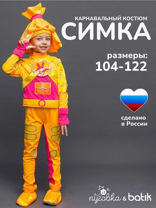 Особенности:Куртка ярко-оранжевая со значками спередиРукава заканчиваются красными перчатками без пальцевБрюки облегающие на резинкеБотинки мягкие объемныеГоловной убор в виде прически СимкиХарактеристики:Материал: полиэстерРост: 104 - 128Производитель: ПуговкаПроизведено по лицензии АО «Аэроплан». Все права защищены.