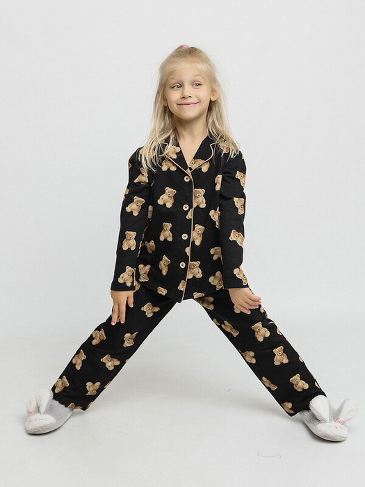 Пижама для девочки черная из футера: футболка с длинным рукавом и брюки. Пижамный универсальный костюм с принтом мишки понравится детям любого возраста. Он отлично подойдет для уютного ночного сна и повседневной носки. Футболка  имеет отвороты на воротнике и застежку на пуговицы по центру. Брюки свободного кроя на резинке.Характеристики:Ткань: Футер 2х нитка пенье 100% хлопокПроизводитель: batik
