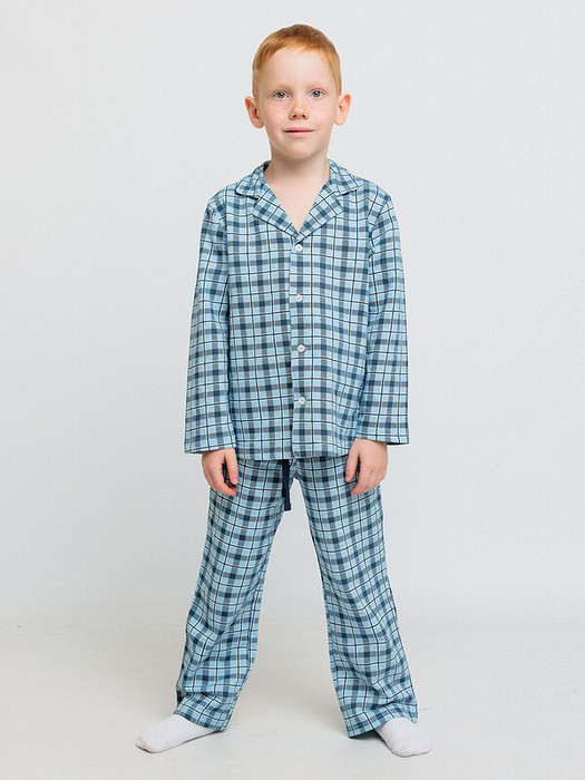 Пижама для мальчика трикотажная из футера голубая в клетку. Легкая пижама для мальчиков изготовлена из натурального 100% хлопка. Мягкая ткань без добавлений синтетических волокон гипоаллергенна, идеально подойдёт для нежной кожи ребенка, сохранит тепло и позволит ей дышать. В комплекте рубашка на пуговицах и брюки на резинке.Характеристики:Ткань: