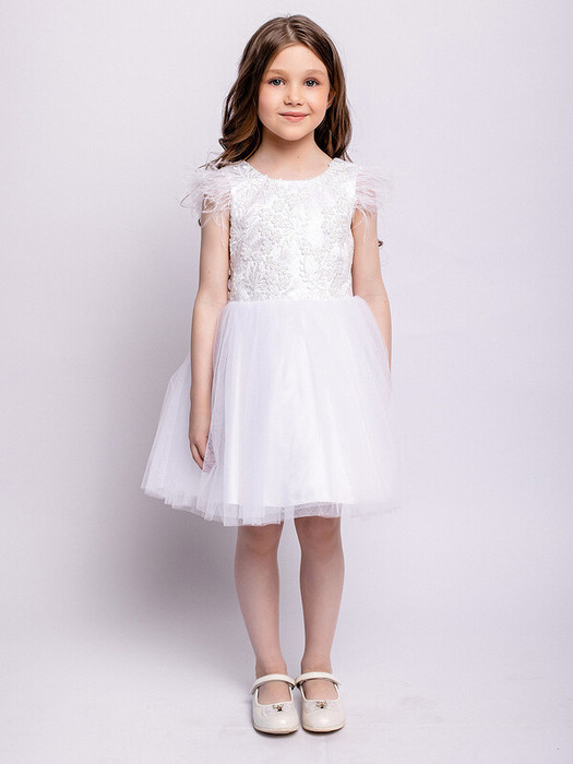 Нарядное белое платье с пышной юбкой из фатина. Гипюр на лифе, рукава из перьев. На спинке имеется поясок, чтобы дополнительно утянуть талию. Подкладка 100% хлопок.Характеристики:Ткань верха: Сатин - ПолиэстерГипюр - ПолиэстерСетка - ПолиэстерПодкладка 100% хлопокПроизводитель: batik