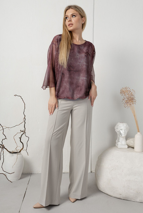 Шифотновая блузка с нижним слоем тонкого трикотажа. Рукавчики выкроены уголочками,по низу идет трикотажная планочка, которую можно по желанию либо опускать, либо прятать вверх.