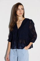 Особую динамику и индивидуальность блузе придают детали: цельнокроеные рукава три четверти подчёркивают целостность и плавность линий, а притачной пояс и манжеты, собранные в нежную сборку благодаря эластичной резинке, создают выразительный контраст с текучестью основной ткани. Эта умная конструкция позволяет вам самостоятельно регулировать длину блузы, творчески преобразуя её силуэт - от парящего и расслабленного до более собранного и чёткого.