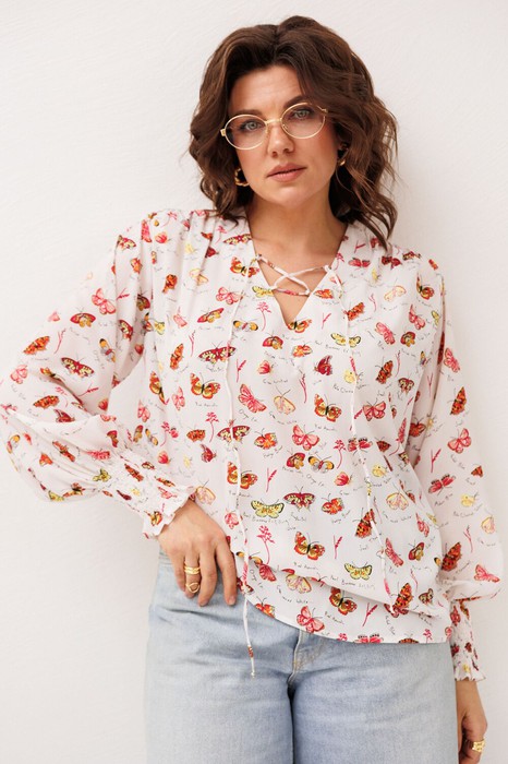 Особое очарование модели придаёт выразительный принт с бабочками - нежный, живой и очень красивый, он наполняет образ лёгкостью и мягкой романтикой. Эта блуза отАнелли создана для каждого дня, когда хочется выглядеть мило, женственно и чувствовать себя естественно красивой.