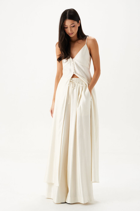 Блузон длины макси выполнен из ткани молочного цвета. Силуэт свободный. Бретели регулируемые. Лиф отрезной фигурный, двойной, по бокам выточки. Без подкладки. Застёгивается от груди на ряд пуговиц. Длина по спинке 112 см