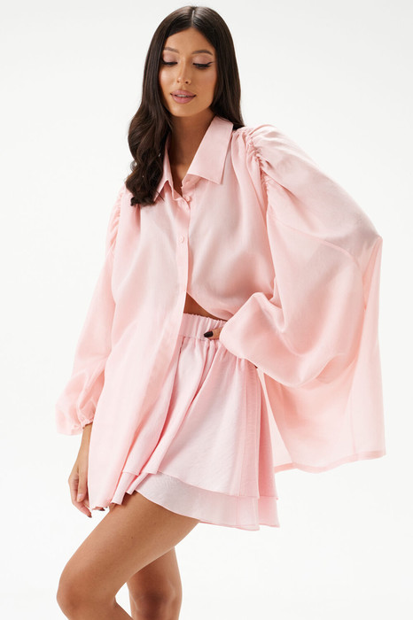 Рубашка свободного кроя, выполнена из полотна розового цвета. Воротник отложной на стойке. По плечевым швам сборка. Рукав втачной, со спущенной линией плеча, низ рукава на резинке. Спинка цельная. Застежка центральная пуговицы. Низ прямой. Длина рукава от края горловины 73 см. Длина по спинке 73 см.